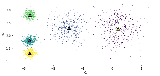 # 데이터 시각화 코드에 클러스터 중심에 triangle로 표시하는 코드 추가